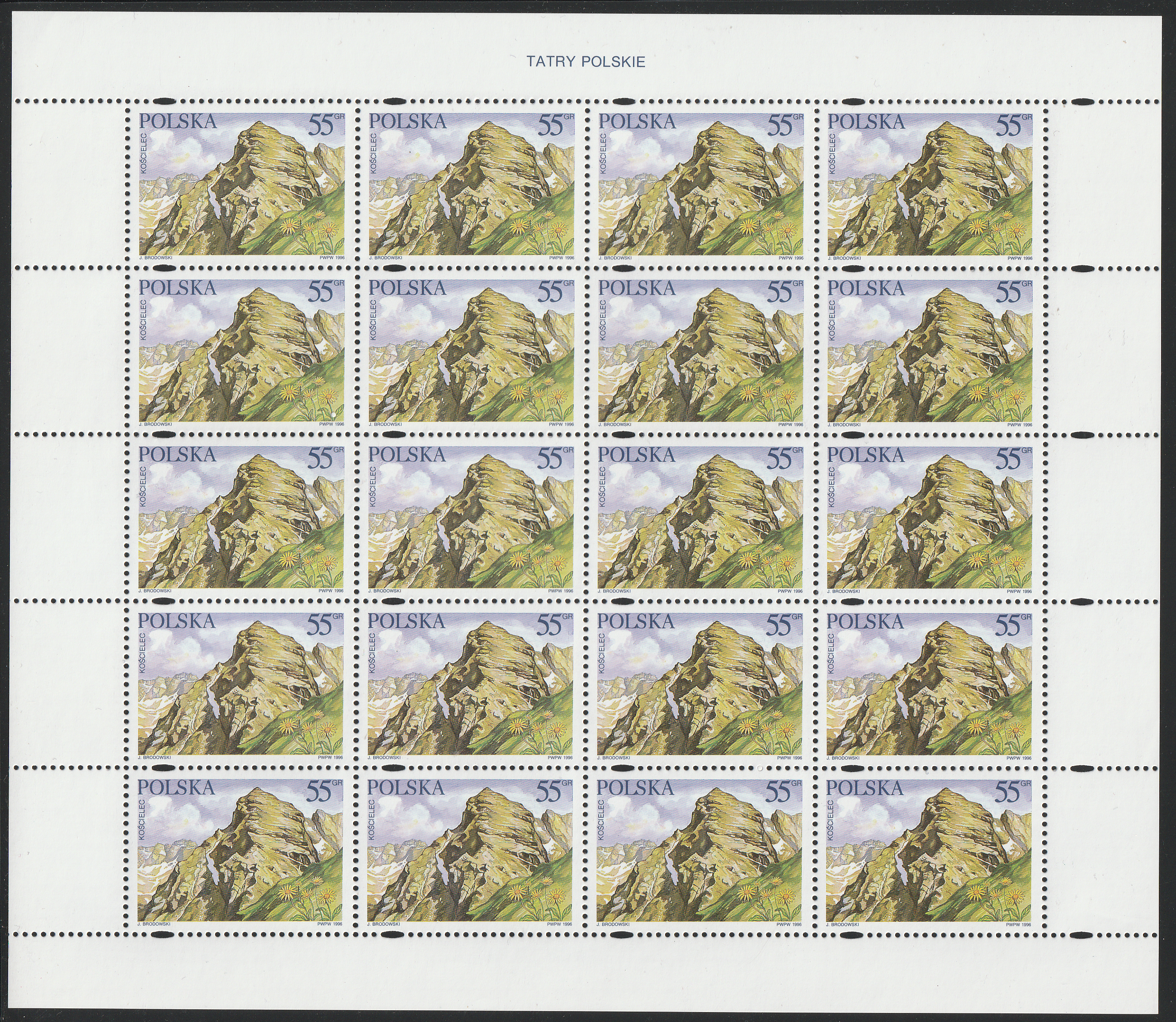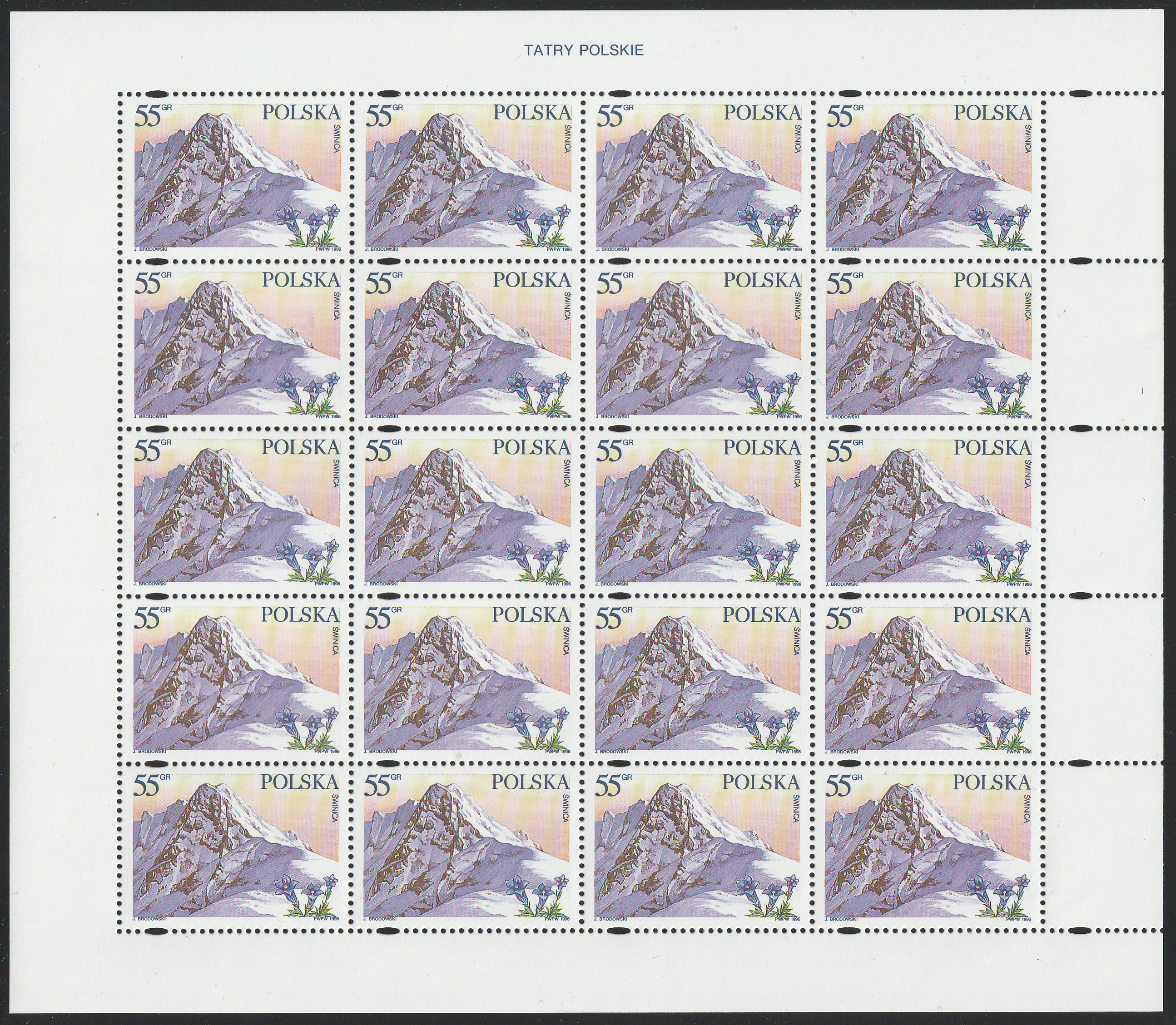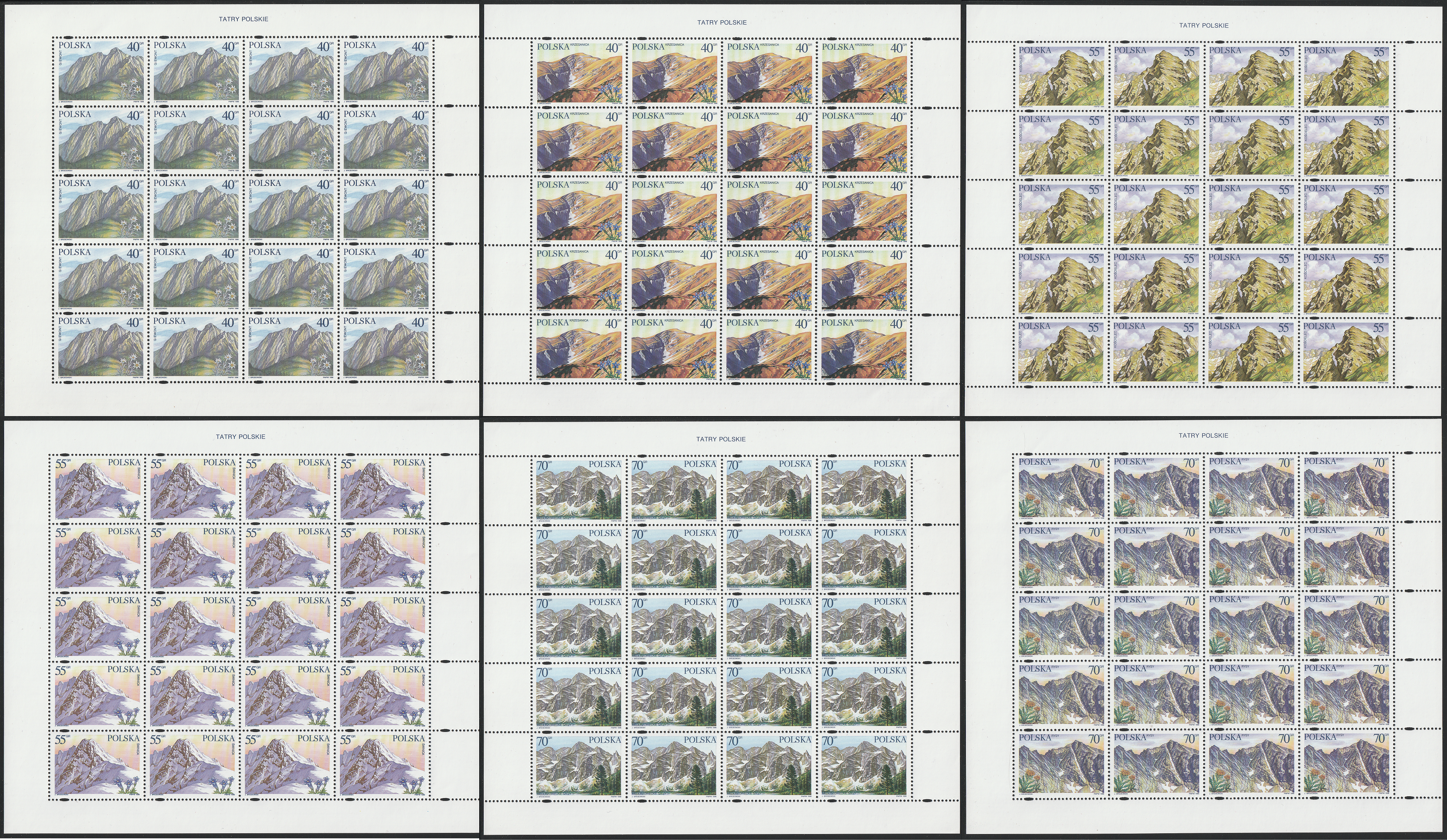 Komplet sześciu arkuszy 20 znaczkowych z emisji Tatry Polskie. Arkusze Giewont i Rysy mają delikatnie zagięte lewe, górne, rogi.
