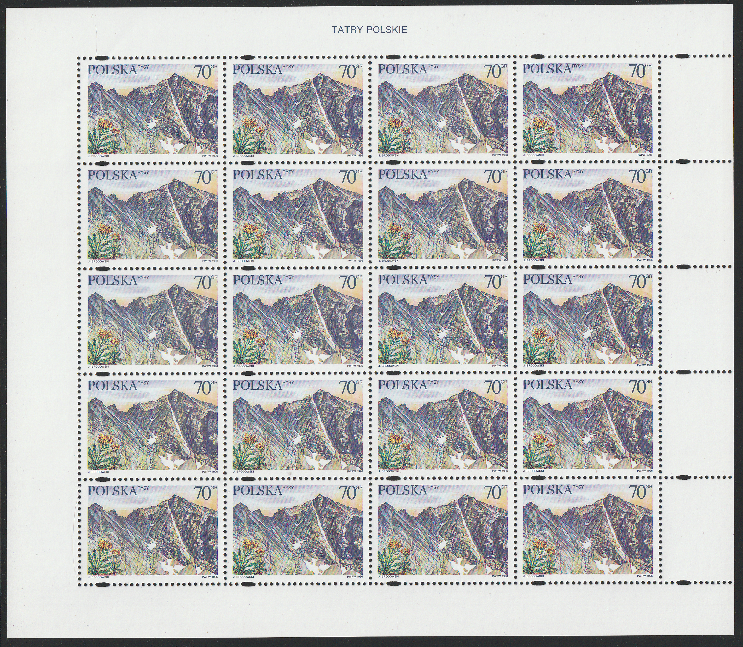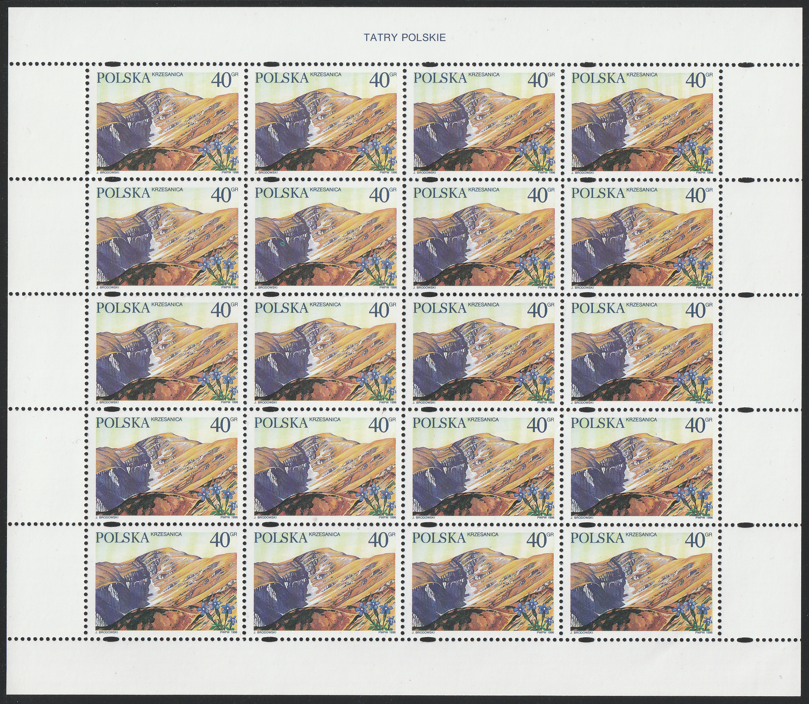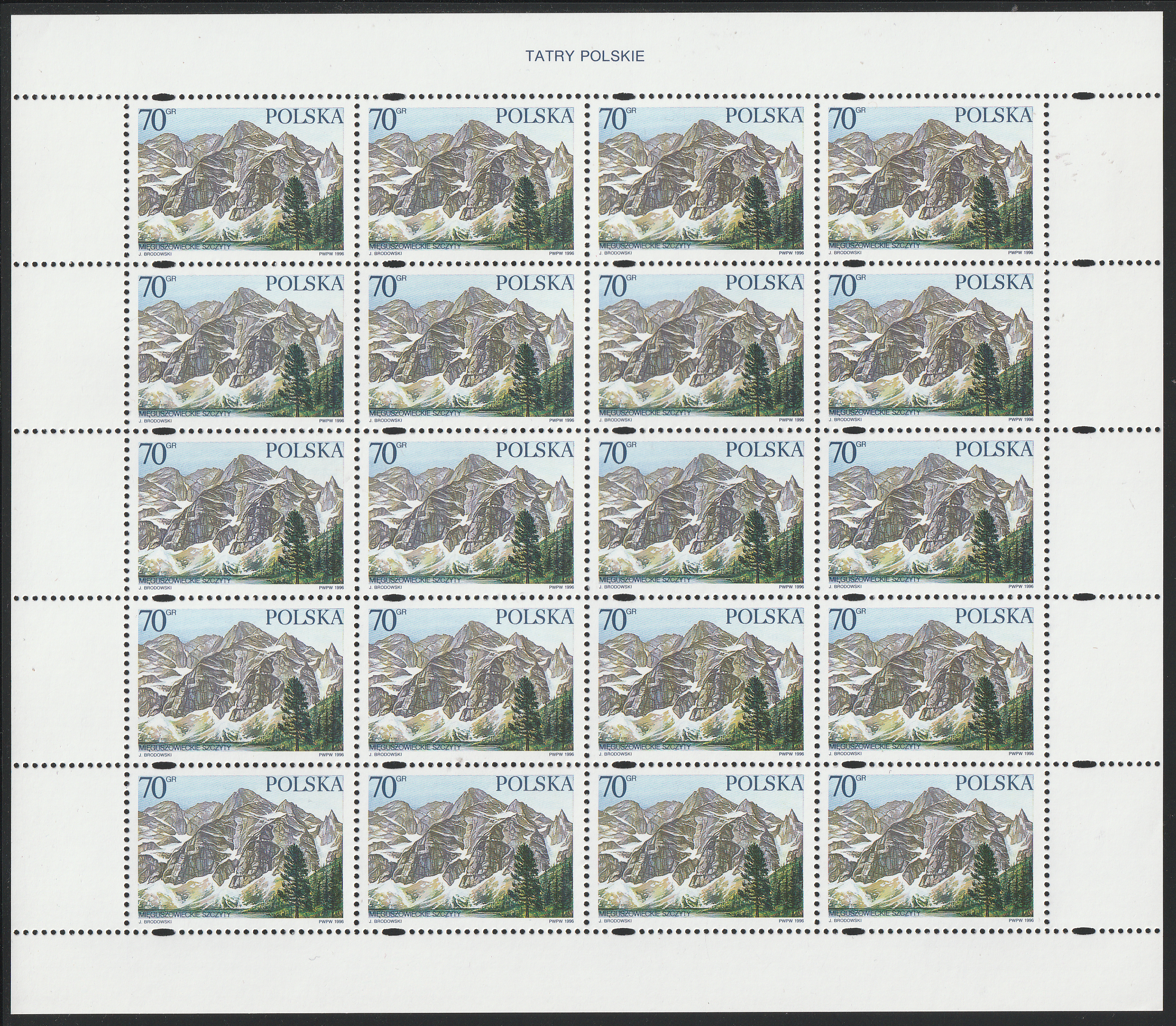 Komplet sześciu arkuszy 20 znaczkowych z emisji Tatry Polskie. Arkusze Giewont i Rysy mają delikatnie zagięte lewe, górne, rogi.