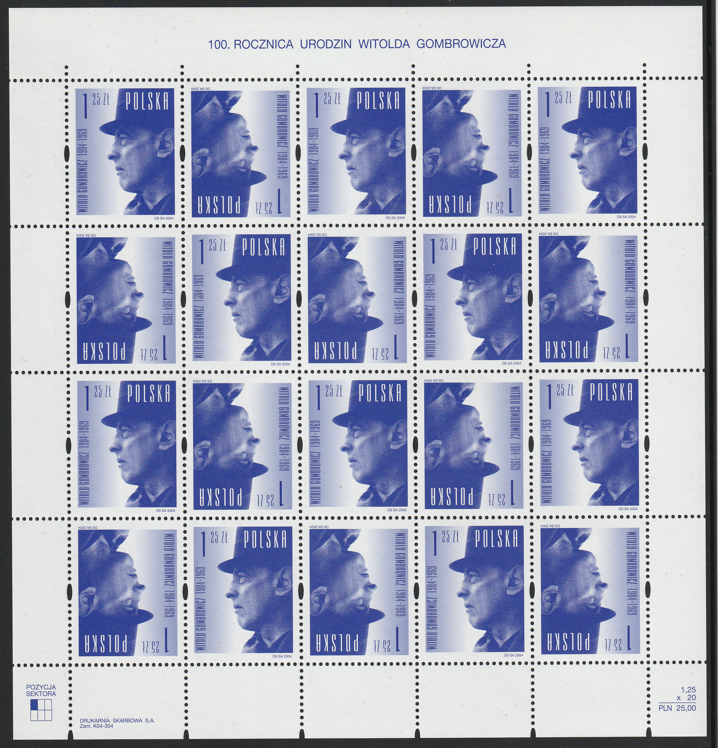 Fi. 3980 - 100. rocznica urodzin Witolda Gombrowicza - górny margines nieperforowany